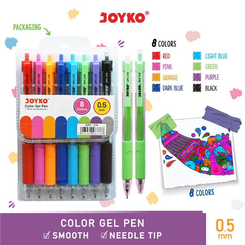 Color Gel Pen Pena Jel Warna Joyko GPC-278 8 Warna 0.5 mm